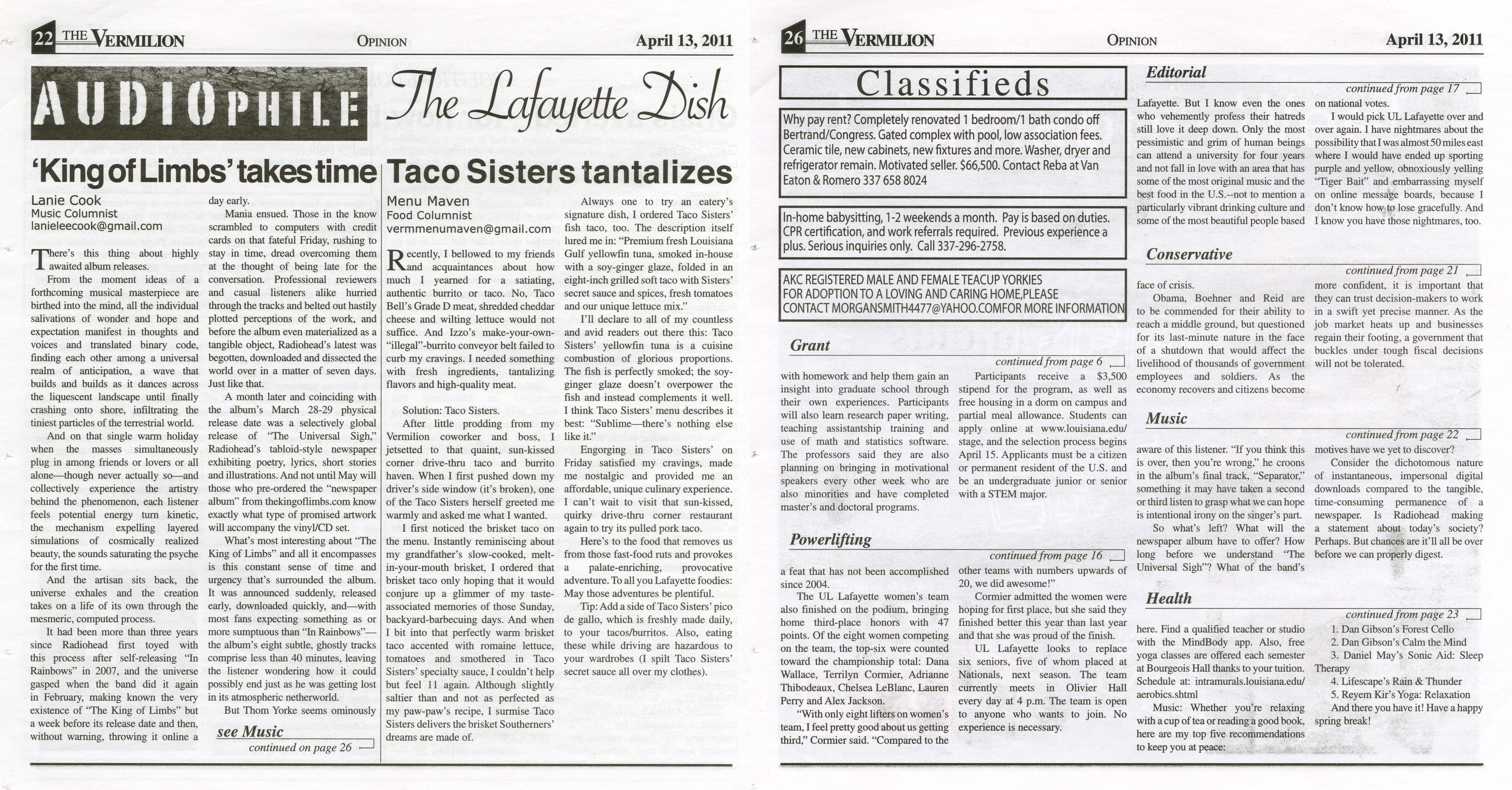 A month later and coinciding with the album’s March 28-29 physical release date was a selectively global release of “The Universal Sigh,” Radiohead’s tabloid-style newspaper exhibiting poetry, lyrics, short stories and illustrations. And not until May will those who pre-ordered the “newspaper album” from thekingoflimbs.com know exactly what type of promised artwork will accompany the vinyl/CD set.